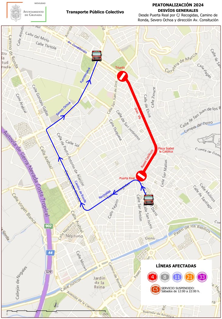 Afectación al servicio de Transporte Urbano Colectivo de Granada con motivo de la peatonalización los domingos de c/ Reyes Católicos (tramos entre Puerta Real y c/ Cárcel Baja) y Gran Vía de Colón (tramo entre Plaza Isabel la Católica y c/ Cárcel Baja) de 12:00h a 18:00h: